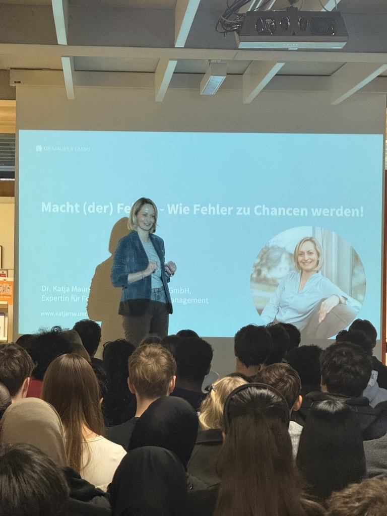 In ihrem lebendigen Vortrag zeigte Frau Maurer, welchen Wert Fehler für persönliches Wachstum und gemeinsames Lernen haben können. Sie machte deutlich, dass eine offene und konstruktive Fehlerkultur nicht nur im schulischen Alltag, sondern auch im späteren Berufsleben ein entscheidender Erfolgsfaktor ist. Mit vielen anschaulichen Beispielen und interaktiven Elementen gelang es ihr, die Jugendlichen unmittelbar abzuholen.