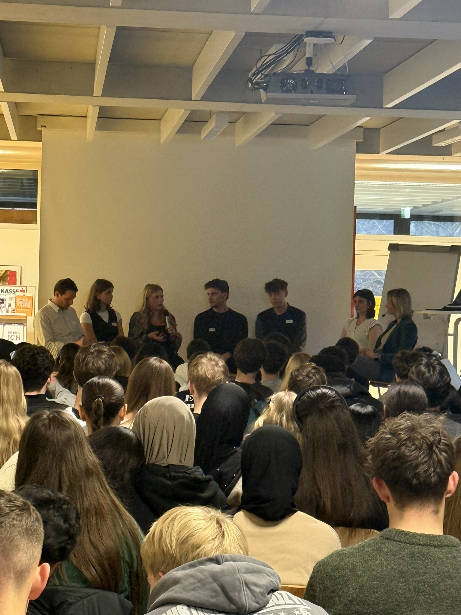 Im Anschluss an die Keynote fand eine Podiumsdiskussion statt, an der sowohl Schülerinnen und Schüler als auch Lehrkräfte teilnahmen. Gemeinsam setzten sie sich mit der Frage auseinander, wie Fehler an der Schule wahrgenommen werden und wie ein Umfeld geschaffen werden kann, das Mut, Experimentierfreude und Lernbereitschaft fördert. Auch mehrere Klassenpaten zeigten großes Interesse am Thema und nahmen aktiv an der Veranstaltung teil.